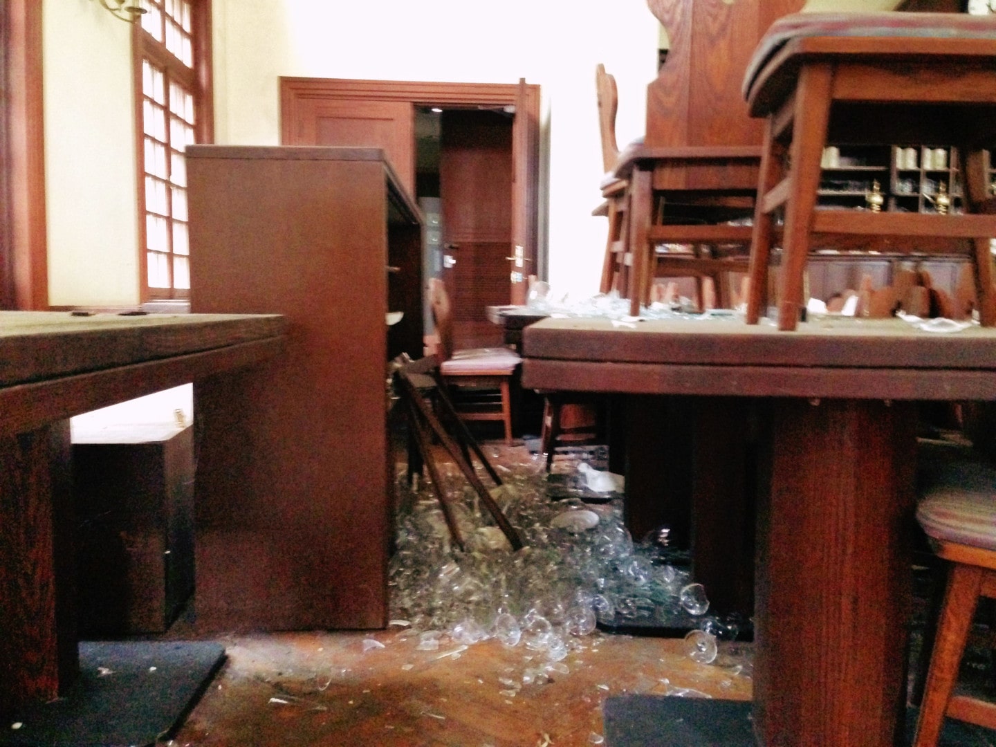 The bar was fully stocked with beer boots and steins, but some of the shelves had been knocked down and piles of broken glass were on the floor.
