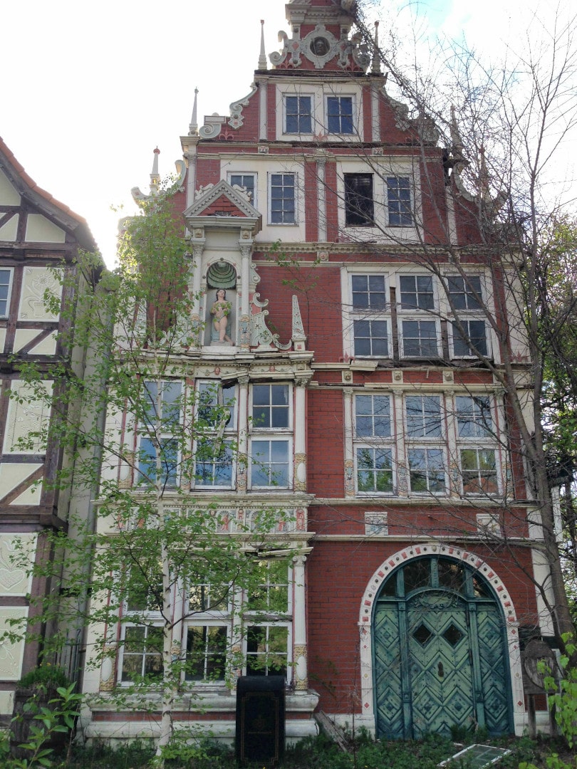 Visitors to The Gluck Kingdom could see a recreation of the Brothers Grimm village with half-timbered houses and a forest environment. There is a replica of the Hanau City Hall with a bronze statue of the Brothers Grimm in front, just like in Hanau, Germany (link to Britannica). There are fountains with statues of German musicians and writers. A huge statue of the Bremen Roland stands guard nearby the entrance. There is a central Marktplatz surrounded by buildings of medieval German-style architecture. One of the main buildings is a recreation of the Bückeburg Palace (link to their official website).