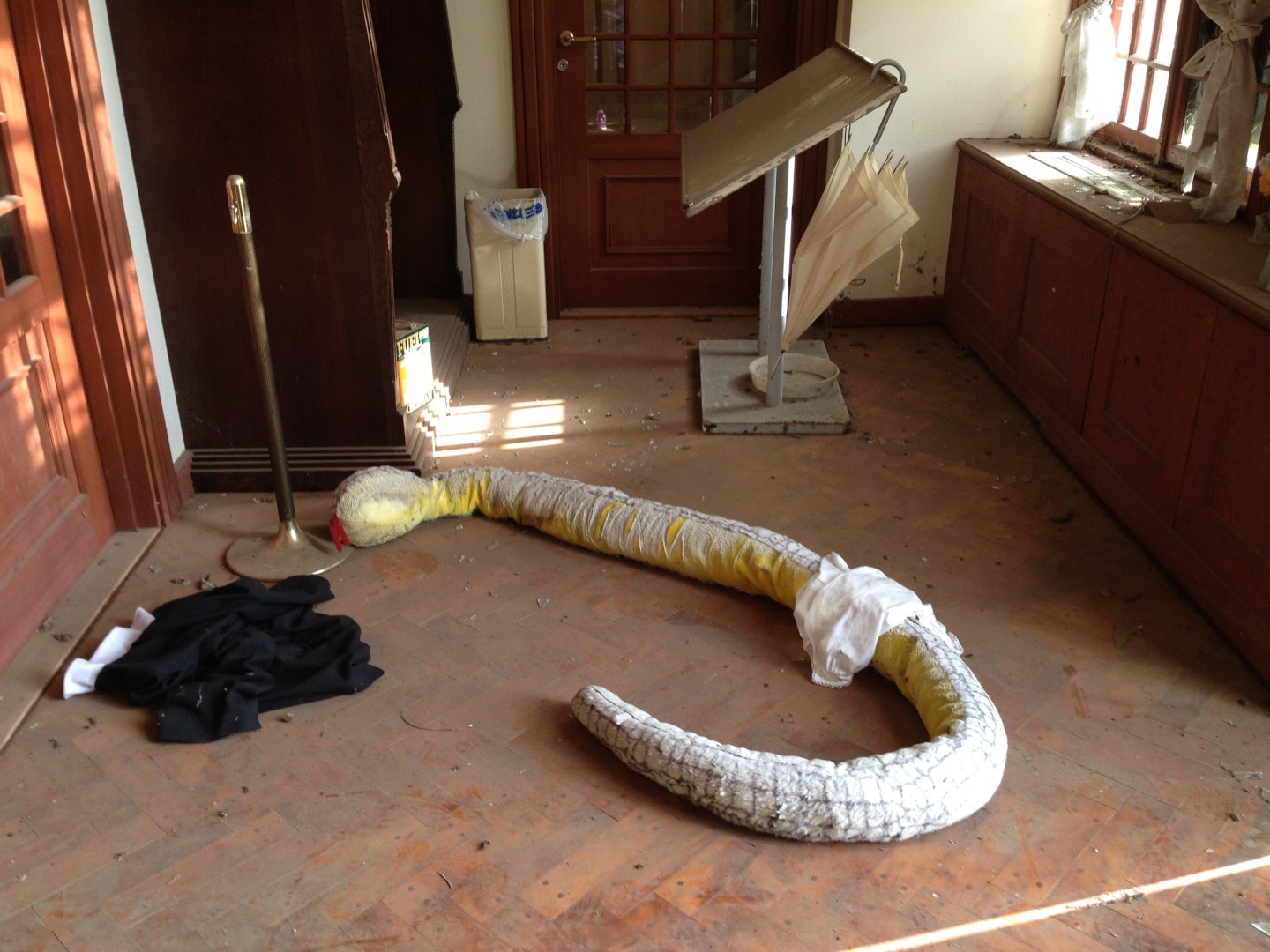 Looking up, mould had begun to spread across the ceiling, staining it black above the light fixtures. A large yellow stuffed snake had been left in the entrance… forgotten by a previous explorer I guess.