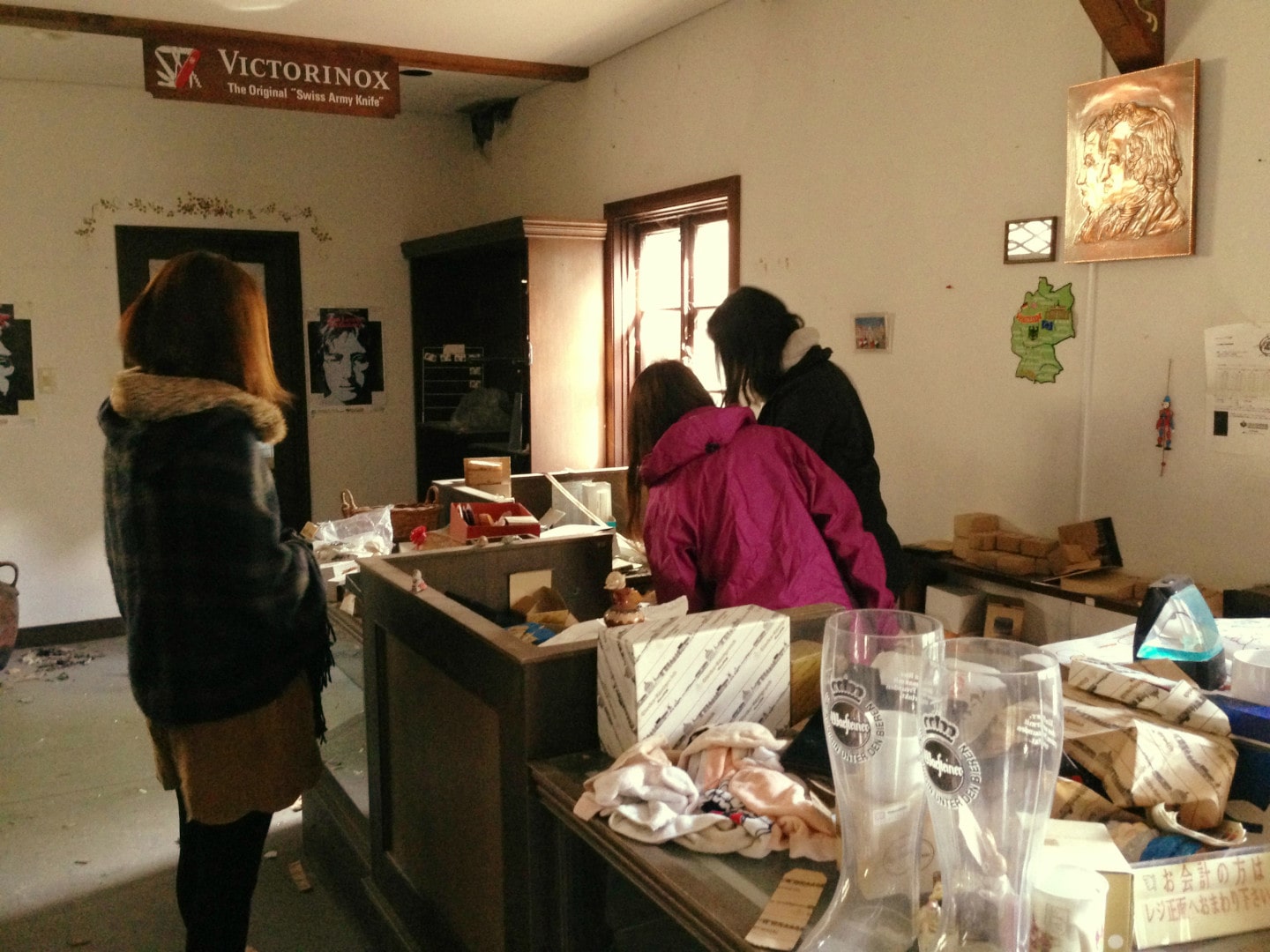 The first thing I noticed was a porcelain doll that had been smashed on the floor, its head broken off and its face missing. Creepy. But when I looked up, I noticed that the whole place was full of objects. Heaps of omiyage (souvenirs) lined the tables and shelves. Candles, dolls, cups, glass, jewellery, key chains, bottle openers, teddy bears, t-shirts, gift bags – all that kind of stuff was just left in there for the taking.