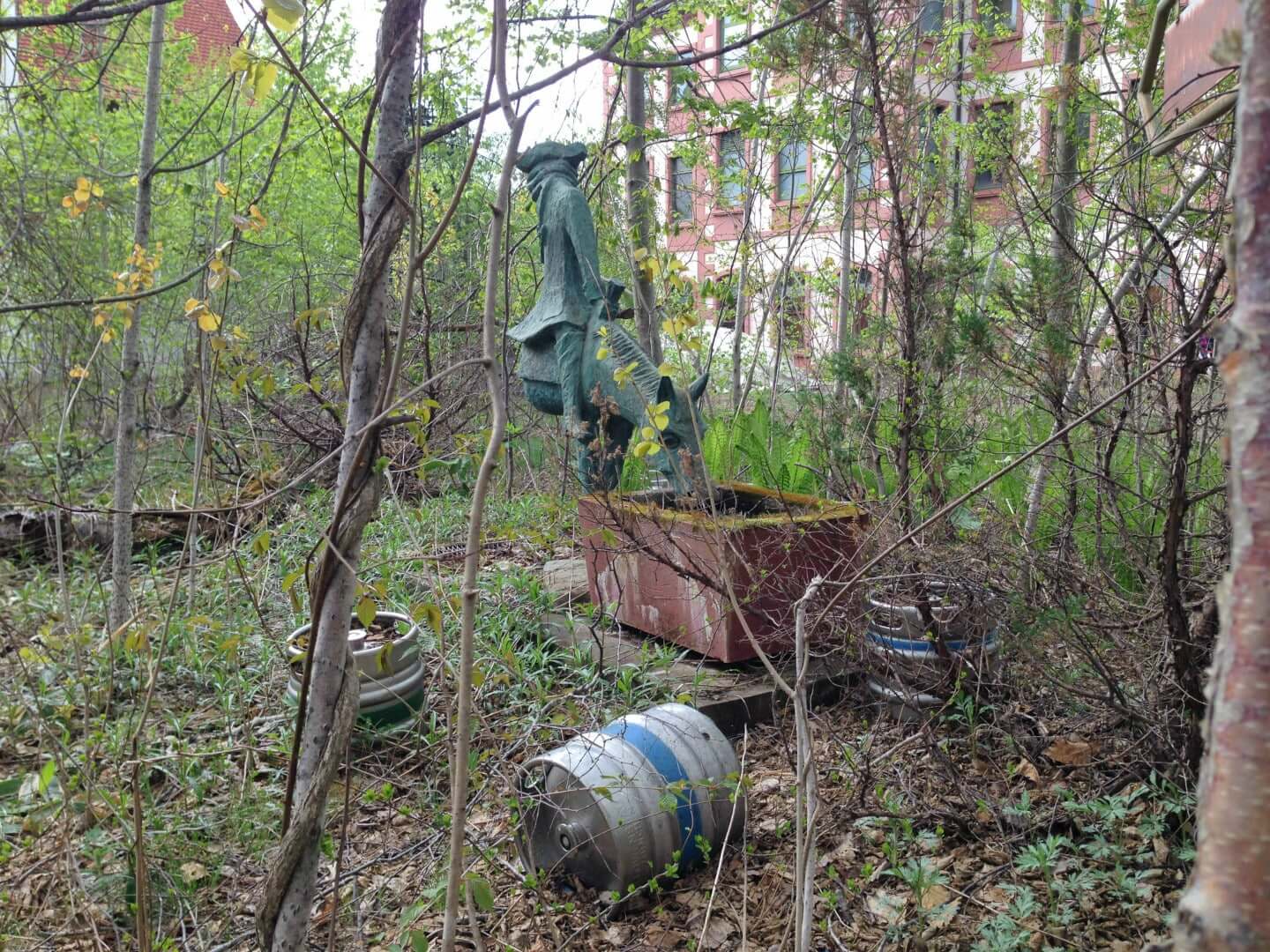 To get into the park we crossed a small bridge and dodged the barbed wire lined between the trees. One section of it was absent so from there we could make a smooth entrance and exit. Most of the plants on the ground had been flattened so I imagine many haikyoists had been there before us. Initially, I was scared of any potential bears that may have been lurking in the woods, but after a while, I just lost all my inhibition and was curious to go deeper into the park.
